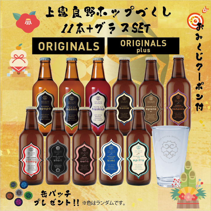 ORIGINALSはもちろん、人気のORIGINALS+(plus)のバックナンバー、そして来週リリース予定の新作【Sorachi Super kamuy】も入れ、さらにお得なグラス、さらにさらには缶バッチもついてくるという、年末年始にふさわしい豪華なセットとなっております。